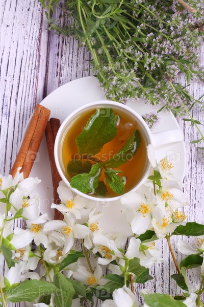 Чай с шалфеем,мятой на белом фоне