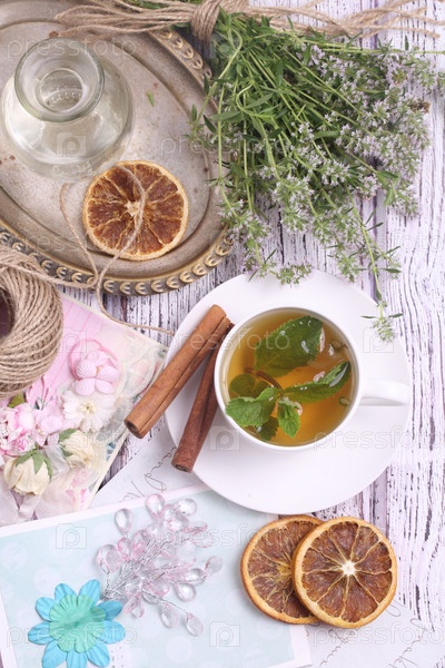 Чай с шалфеем,мятой на белом фоне
