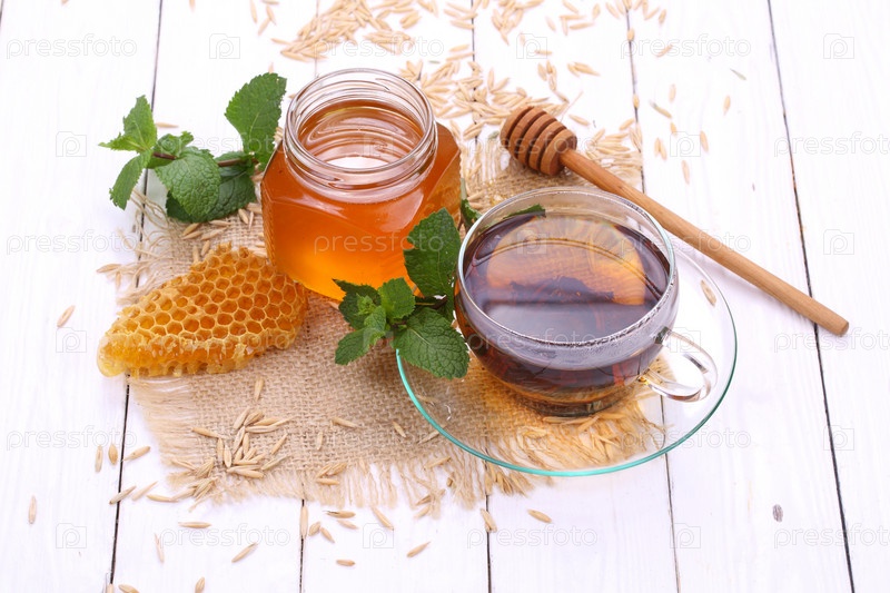 Чай с мятой, медом и лимоном на белом фоне
