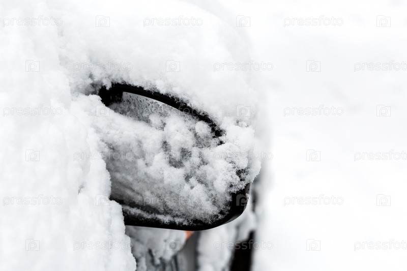 Зеркало автомобиля покрыто снегом после сильной метели зимой