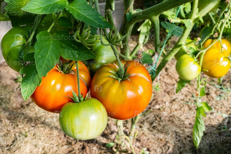 Спелые красные и незрелые зеленые помидоры в теплице