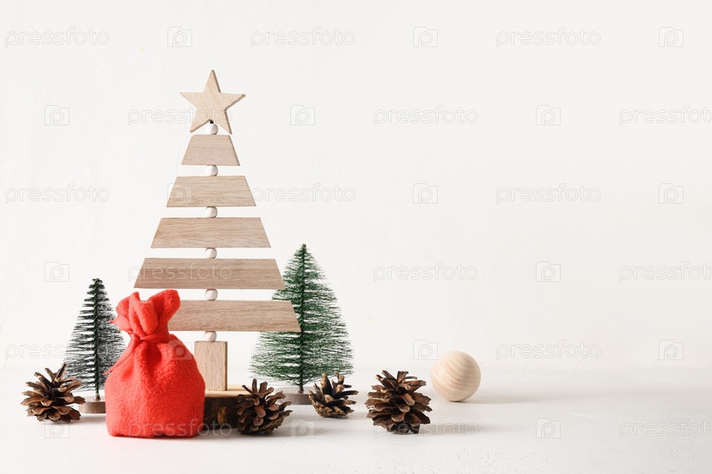 Креативная деревянная эко-елка и сосновые шишки на белом фоне. Сделай сам