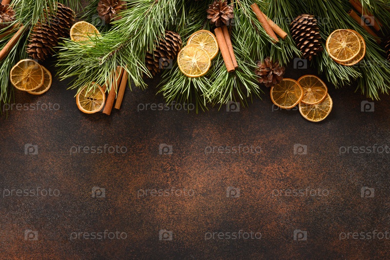 Рождественская граница с долькой апельсина, ароматной корицей, елкой и шишками на коричневом фоне. Новый год. Вид сверху. Рождественская открытка. Скопируйте пространство