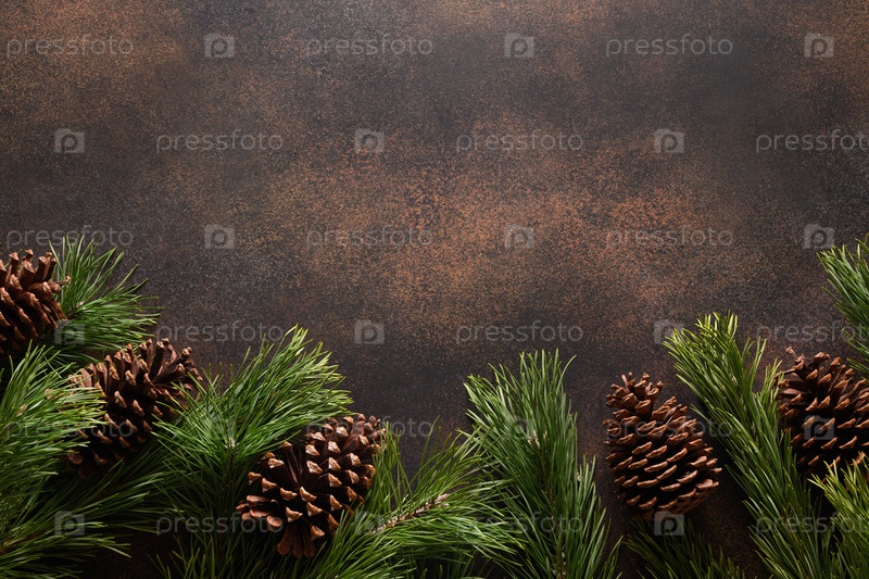 Рождественская граница с вечнозелеными ветвями и шишками на коричневом фоне. Новый год. Вид сверху. Рождественская открытка. Скопируйте пространство