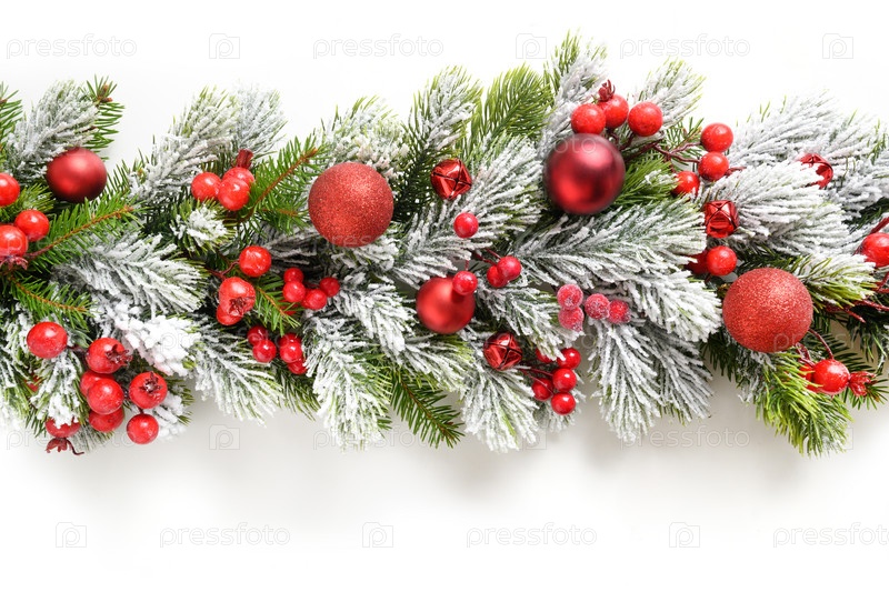 Рождественский баннер с красными безделушками в ряд на заснеженных вечнозеленых ветвях