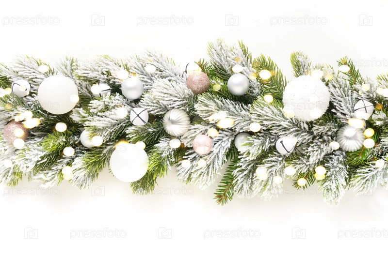 Рождественский баннер гирлянды с белыми безделушками подряд на заснеженных вечнозеленых еловых ветвях, изолированных на белом фоне. Широкий размер