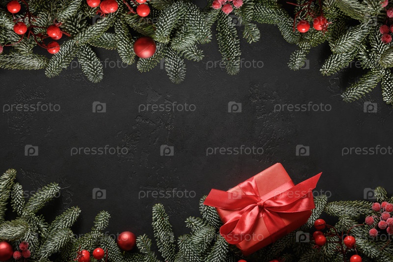 Рождественская рамка с красной подарочной коробкой и праздничными украшениями на черном фоне с копией пространства. Рождественская открытка. С Новым Годом. Вид сверху, плоская планировка