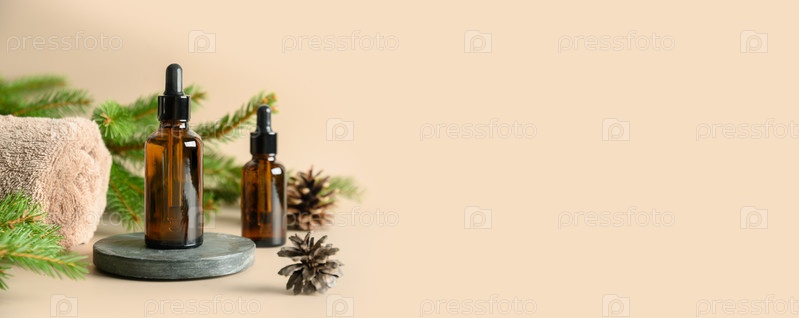 Концепция рождественского спа-салона с косметическим ароматическим маслом, сосновыми шишками на бежевом фоне