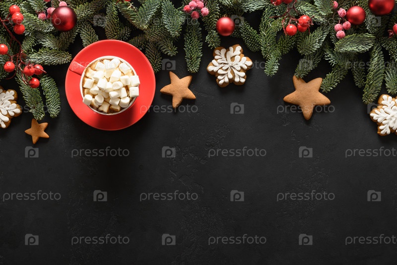 Рождественский кофе с зефиром, глазированным печеньем, красной ягодой падуба на черном фоне. Рождественская открытка с копией пространства. Вид сверху