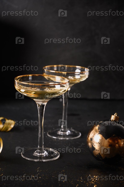 Новогодние бокалы для шампанского и рождественские золотые украшения на черном фоне. Вертикальная композиция. Закрыть