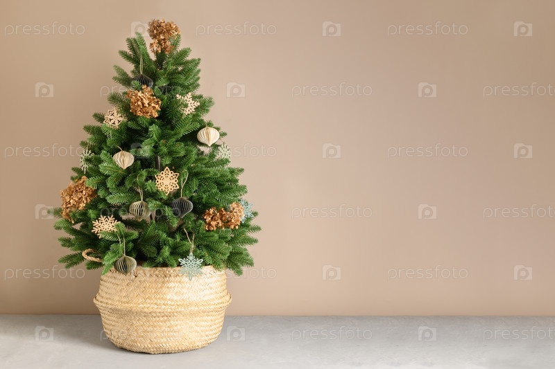 Эко-елка в плетеной корзине украшена сухими цветами и натуральными материалами
