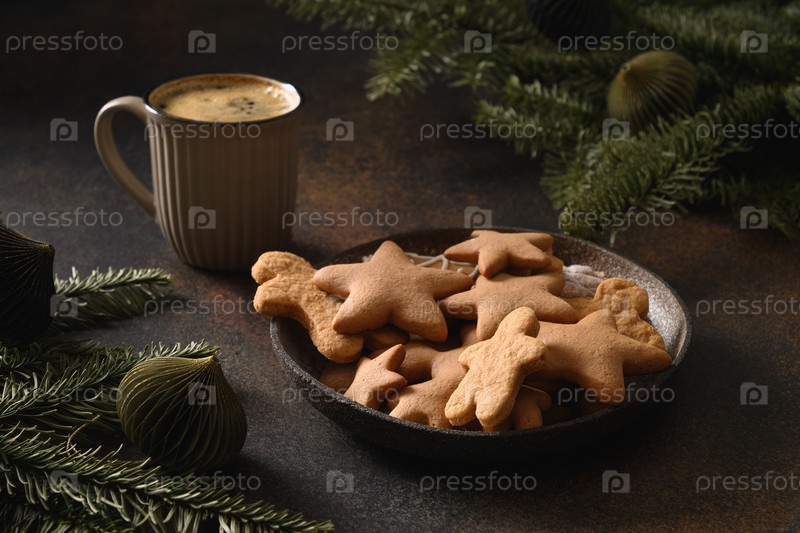 Рождественское печенье и кофе. Рождественская праздничная еда в канун Рождества. Закрыть