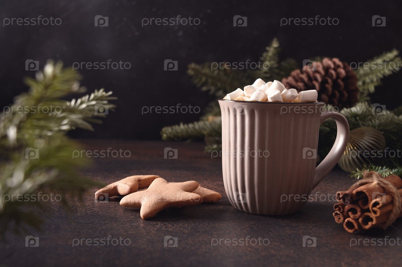 Рождественский кофе или горячий шоколад с зефиром и печеньем. Рождественский десерт в канун Рождества. Закрыть