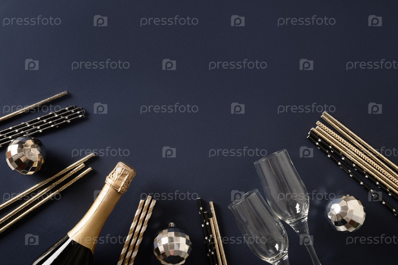 Композиция с новогодним шампанским, соломинками, блестящими серебряными диско-шарами на синем фоне. Вид сверху. Праздничная открытка или приглашение на вечеринку с копией пространства
