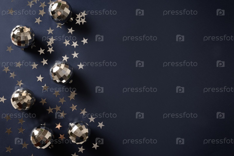 Блестящие диско-шары с лучами на темно-синем фоне. Креативная вечеринка к Новому году