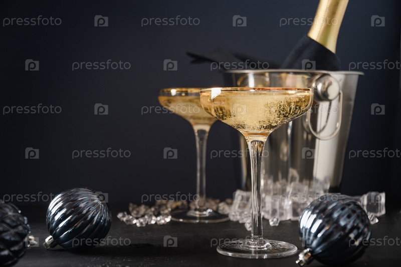 Праздничное новогоднее шампанское в бокалах и бутылка в ведре украшены рождественскими голубыми безделушками на черном фоне. Закрыть. Праздничная открытка с копией пространства