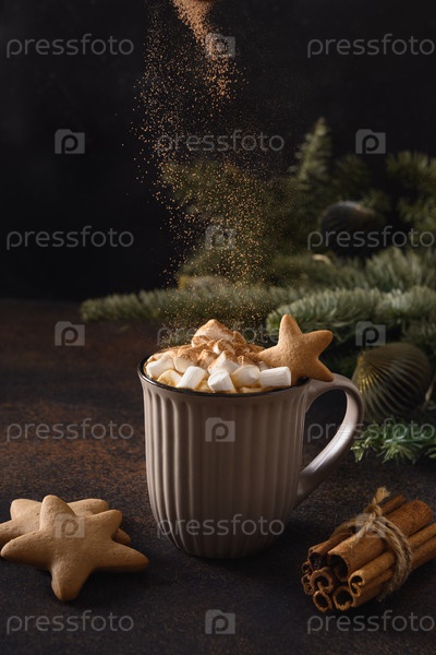 Наливаем корицу на рождественский кофе с зефиром и печеньем. Рождественская праздничная еда в канун Рождества. Закрыть. Вертикальный формат