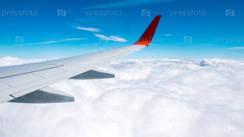Вид на белые облака из иллюминатора самолета. Концепция путешествия