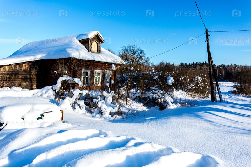 Старая русская деревня с деревянными домами. Раннее зимнее морозное утро