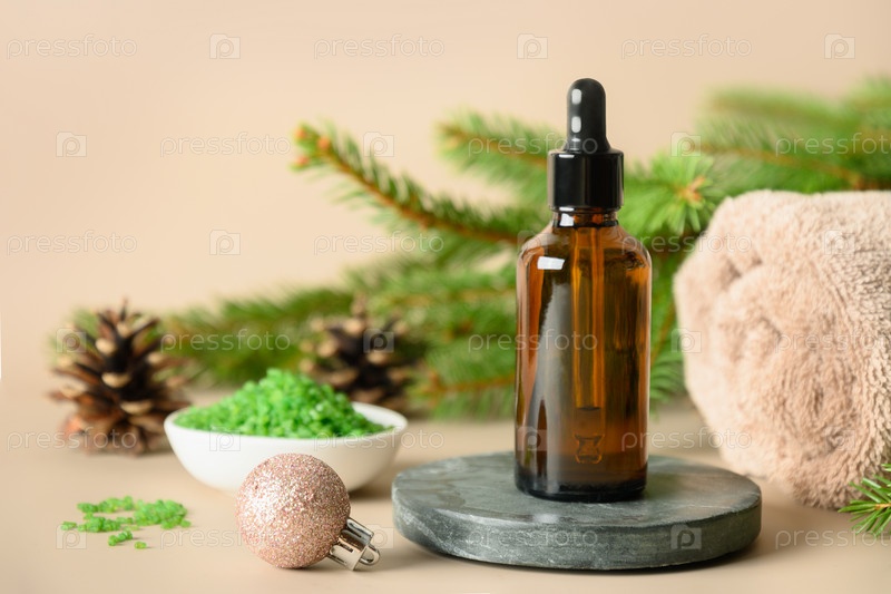 Концепция рождественского спа-салона с косметическим маслом, сосновыми шишками, банным полотенцем и вечнозелеными ветвями на бежевом фоне. Зимний отдых для ухода за телом и хорошего самочувствия. Закрыть