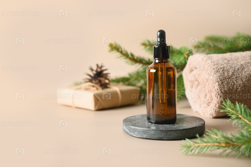 Концепция рождественского спа-салона с косметическим ароматическим маслом, сосновыми шишками на бежевом фоне