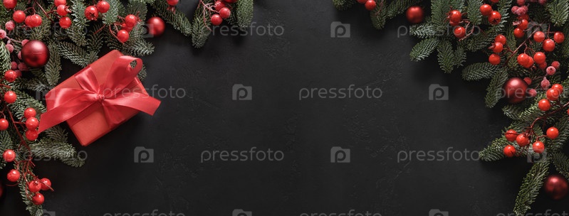 Рождественская рамка с красным подарком и украшениями на черном фоне. Рождественская открытка