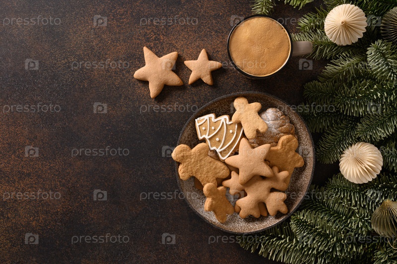 Рождественское печенье и кофе. Рождественская праздничная еда в канун Рождества. Вид сверху