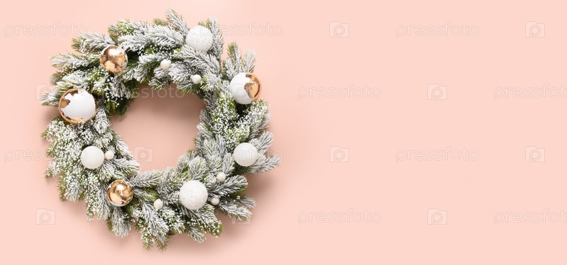 Рождественский венок из снежных ветвей с белыми и золотыми безделушками. Новогодняя открытка