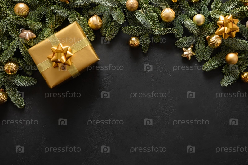 Рождественская рамка с золотым подарком и украшениями на черном. Рождественская открытка