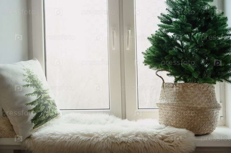 Зимний уютный подоконник с елкой в плетеной корзине, подушка, меховая кожа для отдыха и мечтаний. Рождественский праздник