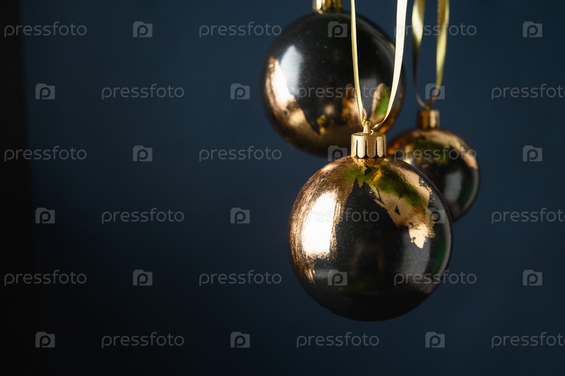 Рождественские черные безделушки украшены золотым металлическим листом на темно-синем фоне. Поздравительная открытка в современном роскошном металлическом тренде