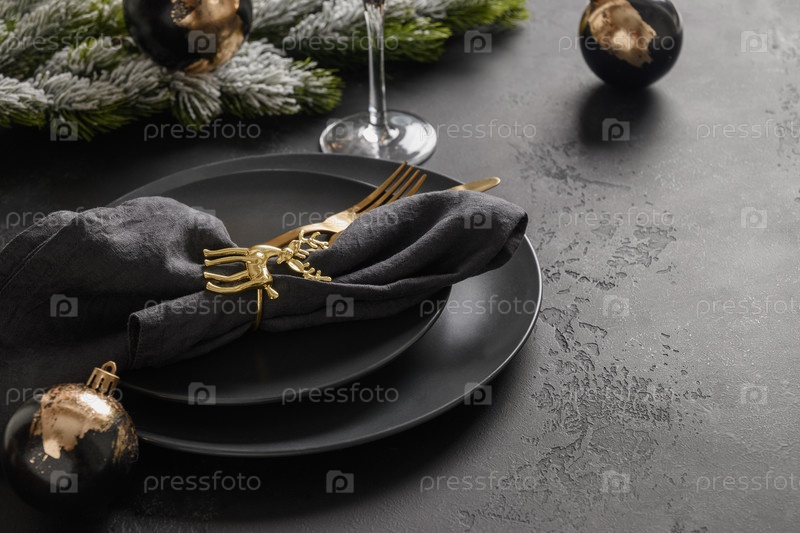 Сервировка рождественского стола с черной тарелкой и золотыми украшениями, кольцом из золотого оленя и столовыми приборами на черном фоне. Закрыть. Скопируйте пространство