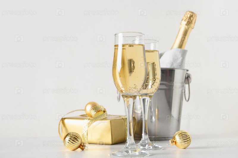 Новогоднее шампанское в бокалах и бутылка в ведре украшены праздничными рождественскими золотыми безделушками на белом фоне. Закрыть. Праздничная открытка с копией пространства. С Новым Годом
