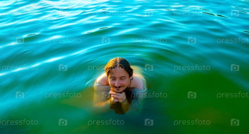Кавказский мужчина плавает в озере с голубой водой