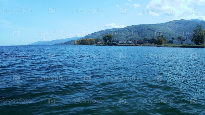 Пейзаж с видом на поселок на берегу Байкала. Иркутская область