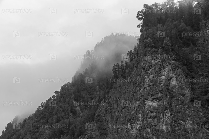 Низкие облака скрывают вершины гор. Скалы на берегу реки Ока Саянская, Иркутская область, Сибирь, Россия. Август. Монохромная версия