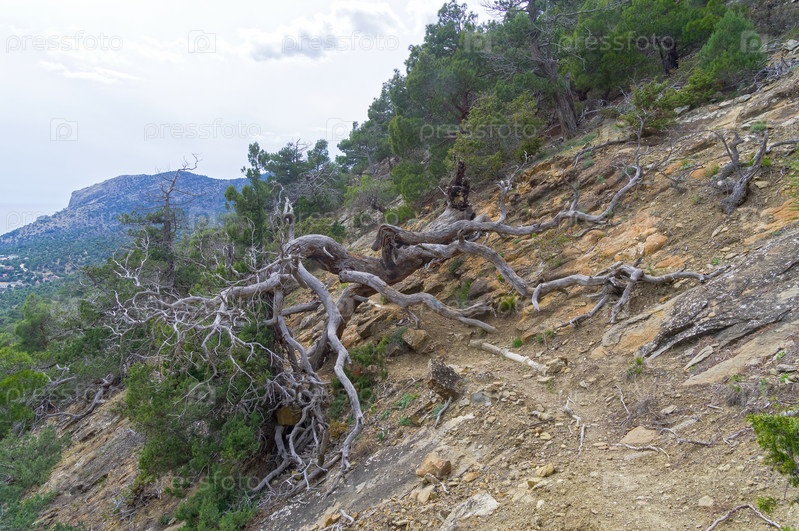 Засохшая реликтовая сосна упала на тропинку и перегородила ее. Горы в окрестностях курортного поселка Нового Света, Крым