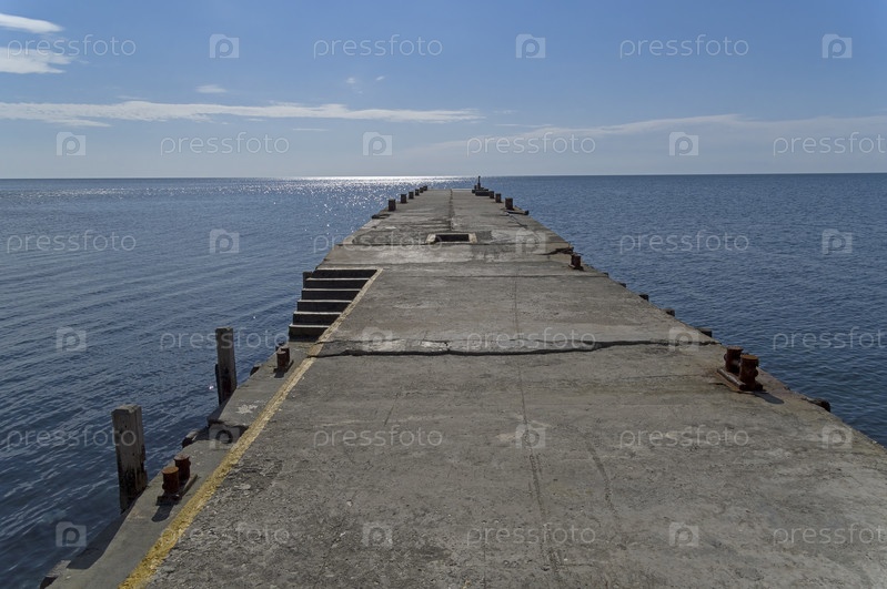 Минимализм в морском пейзаже - вид в стонору горизонта вдоль пустого причала. Крым, солнечный день