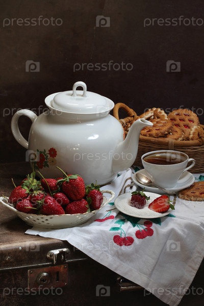 Натюрморт с чайником, клубникой и печеньем на деревянном столе