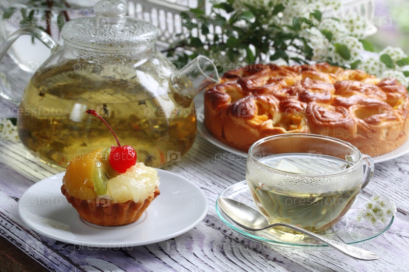 Торт, чашка чая и клубника