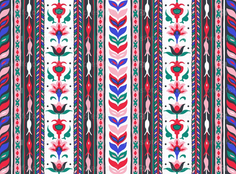 Геометрический дамасский орнамент. Икат границы. Этническая вышивка с листьями и монограммами. Племенная векторная текстура. Бесшовный народный узор в ацтекском стиле. Индийский, скандинавский, цыганский, мексиканский, африканский ковер