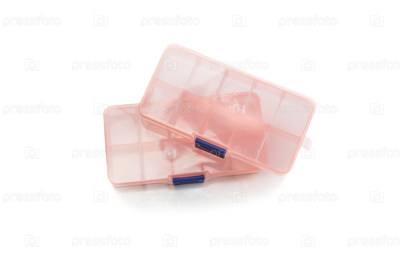 Розовые пластиковые коробки для таблеток и всякой всячины на белом фоне