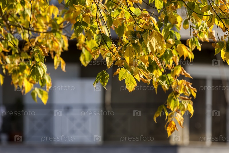 На фоне дома растет дерево с яркими осенними листьями