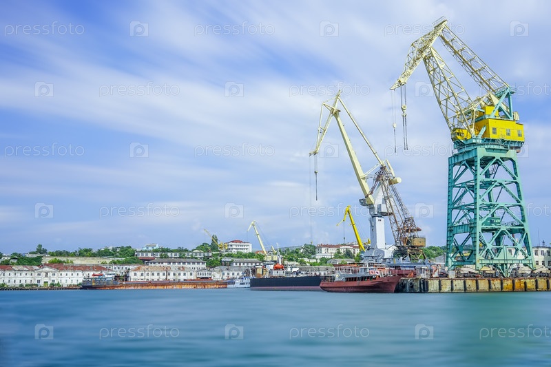 Морской пейзаж с береговой линией порта и большими плавучими кранами