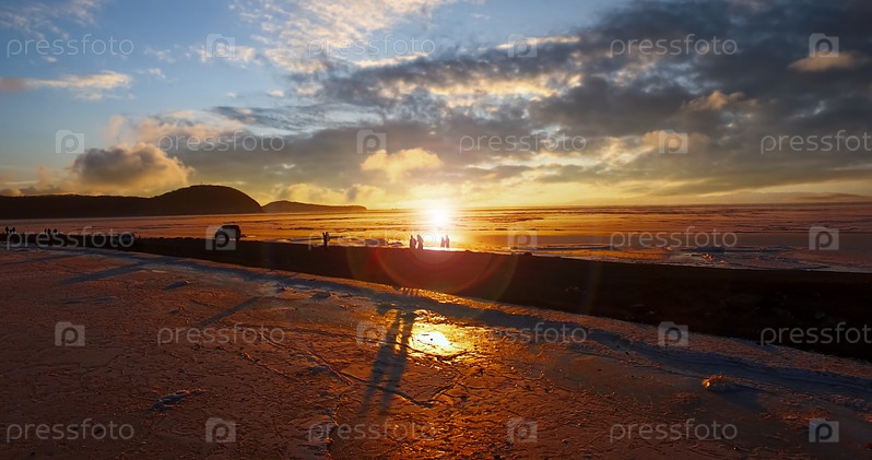 Вид с воздуха на морской пейзаж с видом на закат и Токаревскую косу с силуэтами людей. Владивосток, Россия