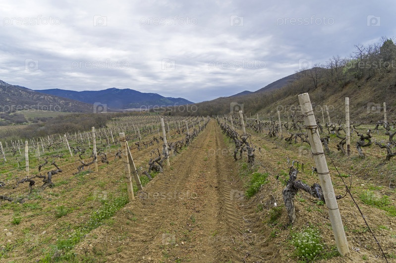 Виноградник весной. Окрестности Судака, Крым, пасмурный день в конце апреля