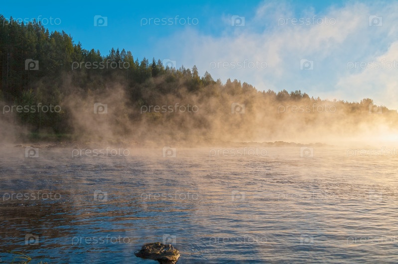 Туман над рекой на рассвете. Река Карелия, Россия. Август