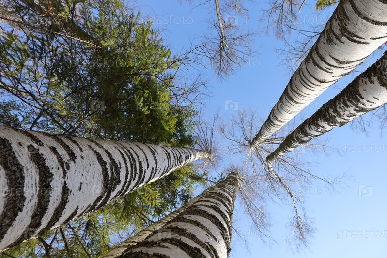 Стволы берез устремленные ввысь к голубому небу вид снизу вверх