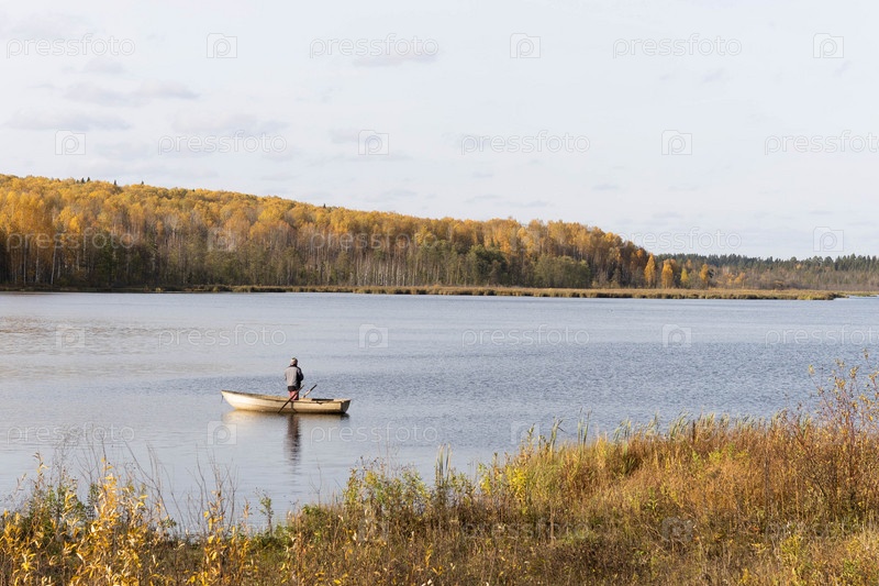 Рыбак на лодке на озере в окружении осеннего леса