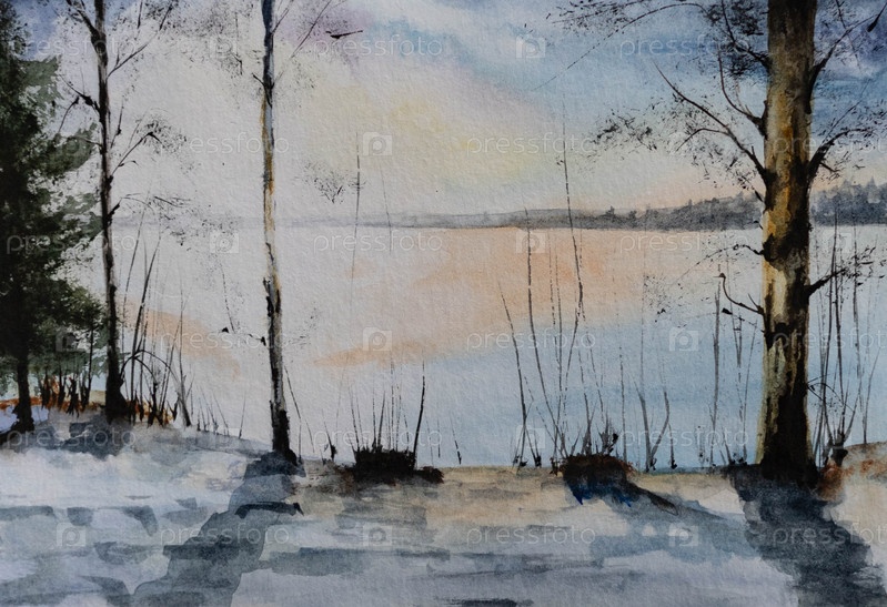 Акварельный рисунок Закат на озере, тени от деревьев на берегу
